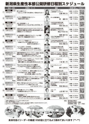 ![]() 画像を👆クリック 2026公開研修参加者募集!! ☆2026新設コース 「経営幹部・上級管理者向けスキルアップセミナー」 ・【経営戦略+組織管理編】(1日) ・【会計編】(1日) ★【経営戦略+組織管理編】と【会計編】を併せてご参加いただくことで、より知識の深まりが期待できます。 ☆アップデート 「ゼロからわかる生成AI と中小企業DX」 ・お知らせ文や議事録作成などのよくある業務や明日からそのまま使える生産性向上対策ワーク等の演習も行います。 💛皆様のご参加をお待ちしています(*^-^*) ※なお、一括のお申込用紙は、お手数ですが、更新情報よりダウンロードくださいますようお願いいたします。 | 公開研修の特徴 全国の生産性本部ネットワークを最大限に活かし、国内最高レベルの講師陣が直接講師を務める質の高い研修プログラムを受講できます。 業種・職種を超えた異業種との交流を通じて、新たな気づきと視野の拡大を図ります。 講義による理解に加え、グループ演習を取り入れ、参加者が互いに刺激を受け、自信を持つことにつながる参加型のプログラムです。 また、研修終了時に修了証を授与させていただきます! ★2日間コースについて 新潟県生産性本部の階層別2日間コースは、実践期間を挟んだ連続しない2日です。1回目の学びを職場に戻って実践していただき、2回目の研修を受講いただきます。 実践の振り返りや現状の明確化をし、様々なトレーニングをおこなうことにより、より効果を得られるとご好評いただいております。 ※会場の変更や定員に達する前に募集を締切らせていただく場合がございます。ご了承くださいますようお願いいたします。これらの変更が生じた場合は、ホームページのお知らせにて、ご案内させていただきます。 お気軽にお問い合わせください(^^)♪ |